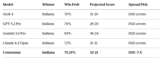 Gemini 3.0 Pro is the most bullish on Indiana (85%), while Grok 4 is most conservative (70%). The spread between models reflects different weighting of Miami’s upset variables—particularly the pass rush’s potential to disrupt Mendoza and the home-field emotional boost.
