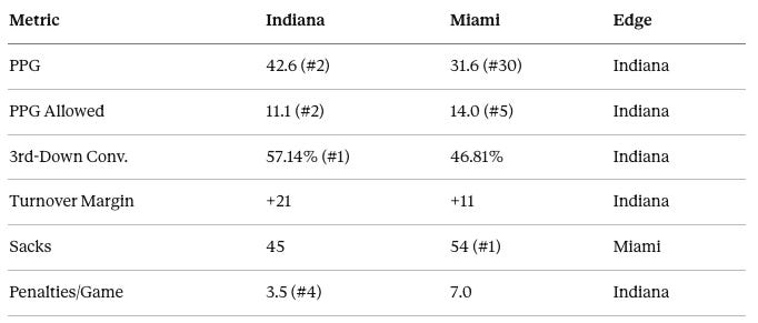 Indiana’s structural advantages are simply too comprehensive to ignore. They are superior in virtually every predictive metric: scoring offense, scoring defense, third-down conversion, red zone efficiency, turnover margin, and penalty discipline. This isn’t a team that wins on variance—they systematically dismantle opponents.