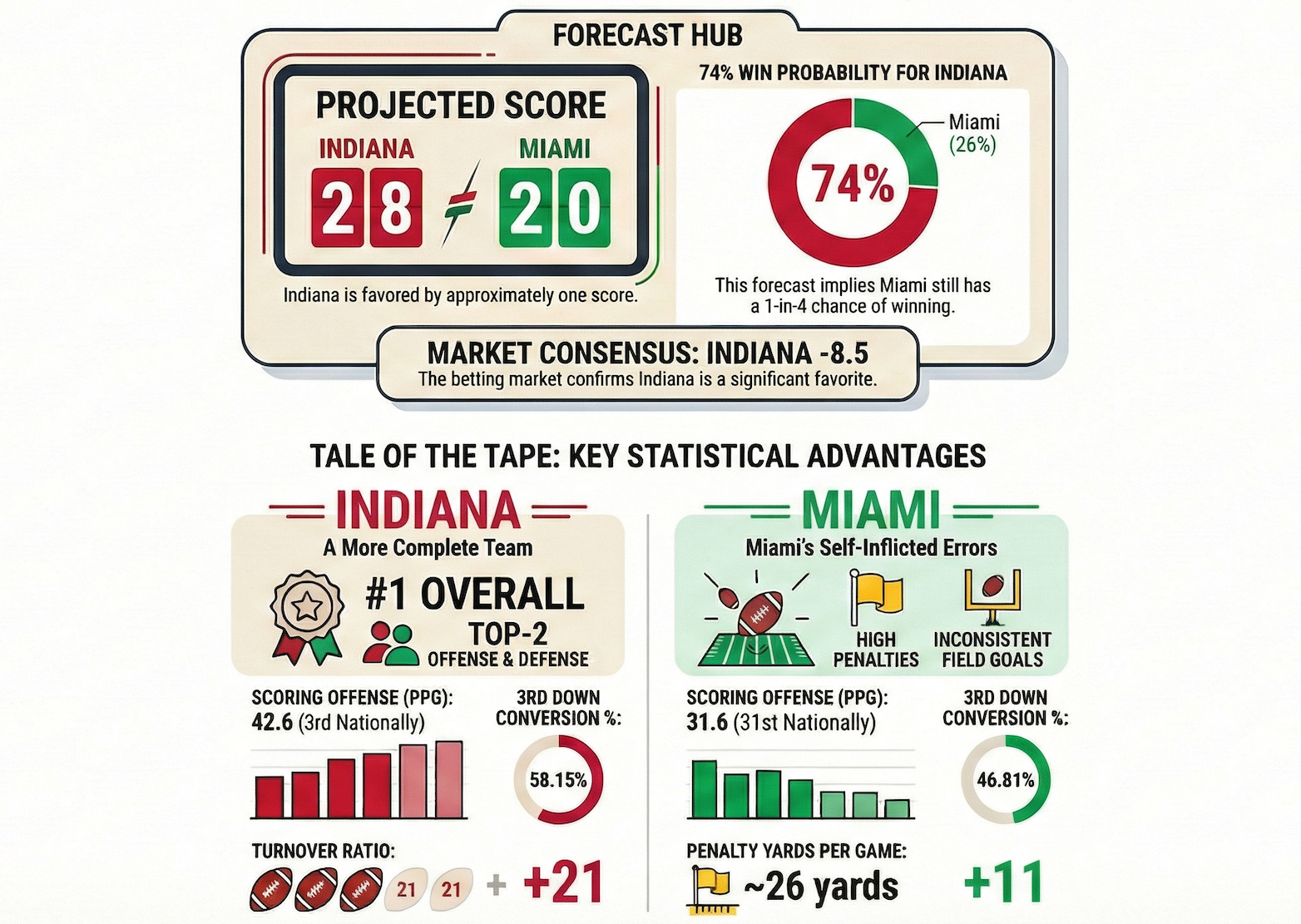 The key to my projection is the red zone battle. Miami will move the ball—they have too much talent not to. But Indiana’s #1-ranked red zone defense (34.62% TD rate allowed) will force field goals where Miami needs touchdowns. Meanwhile, Indiana’s balanced attack—Mendoza’s precision, the Hemby/Black rushing tandem, and receivers like Elijah Sarratt and Omar Cooper Jr.—will convert trips into seven points.