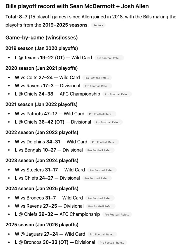 Anyways… Bills lose in the second round of the 2026 playoffs to the Broncos in OT… and Broncos played very well. Elite defense (#2), solid offense, elite coach, playing at mile high… all lived up to the hype.