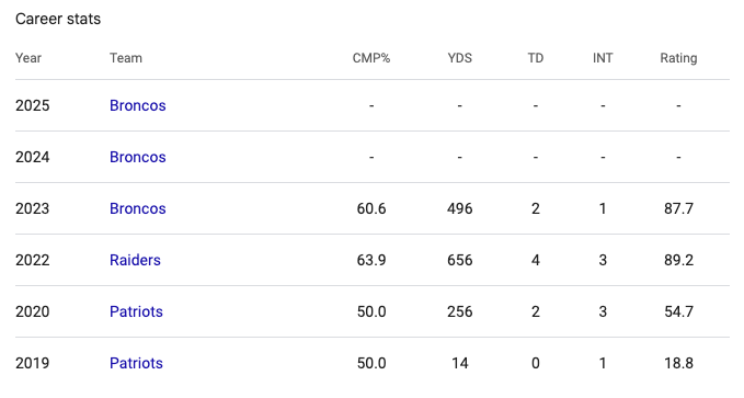 The Broncos turn to Jarrett Stidham, a quarterback whose recent resume is defined by inactivity. Stidham has not attempted a pass in the 2024 or 2025 regular seasons. His total snap count for the 2025 season stands at four, with zero pass attempts.