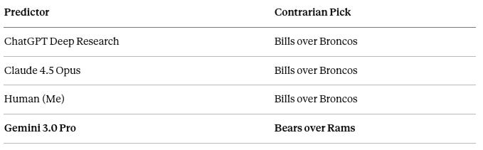Five of six models pick the Rams. But Gemini 3.0 Pro stands alone with a Bears upset prediction, arguing: