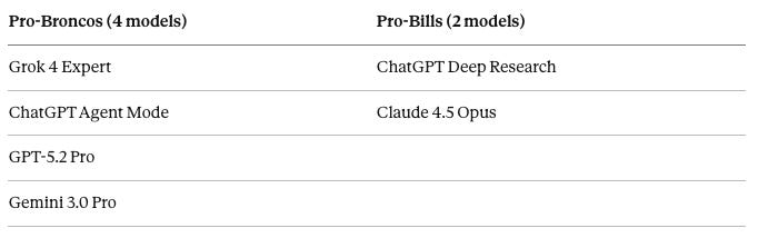 Broncos: Grok 4, GPT-Agent, 5.2-Pro, Gemini 3.0 Pro