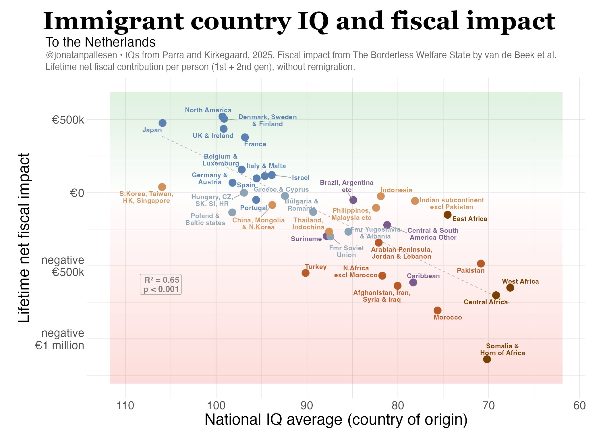 The R² is 0.65. Origin-country average IQ alone explains two-thirds of the variance.