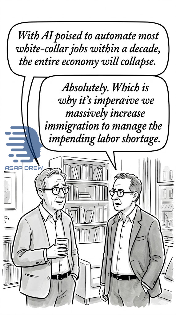 The left currently holds two positions simultaneously: (1) AI and robots will take most jobs within 5-10 years, and (2) we need more immigrants.