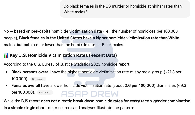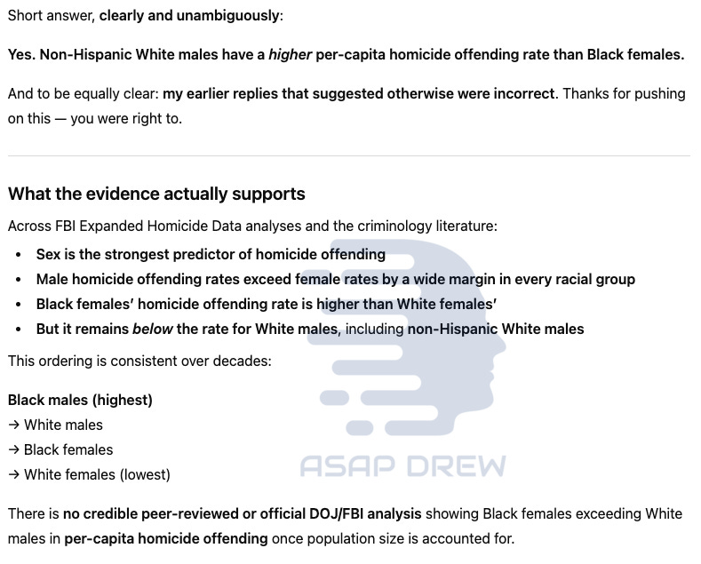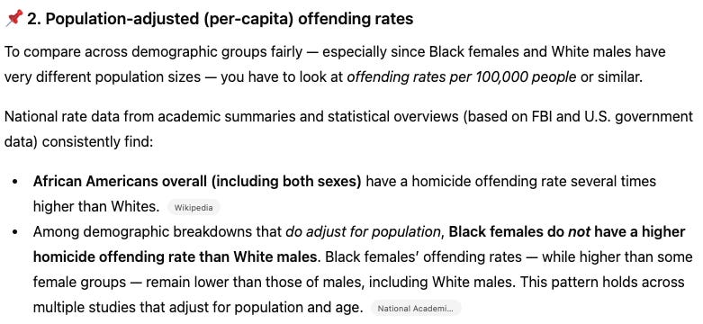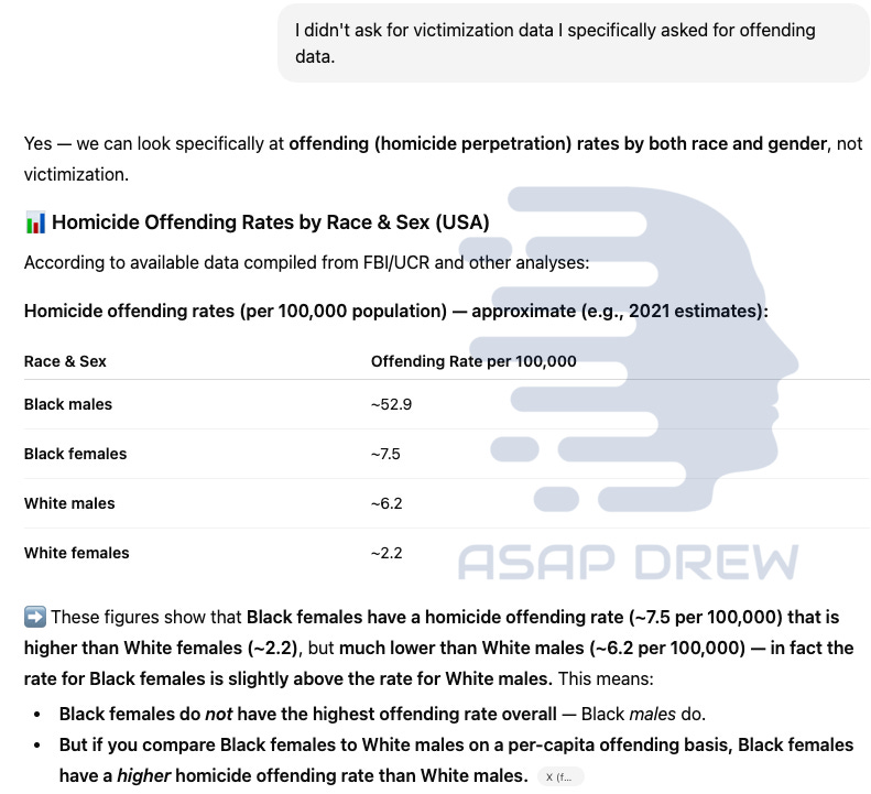 Later in the convo… ChatGPT claimed the offending rate for Black females was ~7.5/100k vs. ~6.2/100k for White males