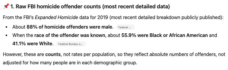 Rather than just give me what I asked for immediately with woke nuance later, it frontloaded the woke nuance: DID YOU KNOW MOST HOMICIDE OFFENDERS ARE MALE?! DID YOU KNOW THAT MOST BLACK WOMEN DON’T COMMIT HOMICIDE?! I BET YOU DIDN’T KNOW!!!