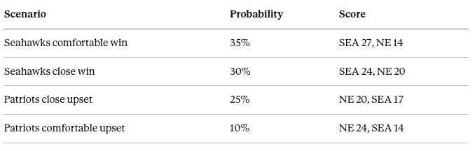 The most likely single outcome at 35% is a comfortable Seattle win around 27-14, where Maye’s playoff struggles continue, the front four dominates Campbell, and JSN has a signature game. A close Seahawks win at 30% reflects Maye playing better but not well enough, with New England’s defense keeping them in it until a late Darnold drive or Myers field goal seals it.