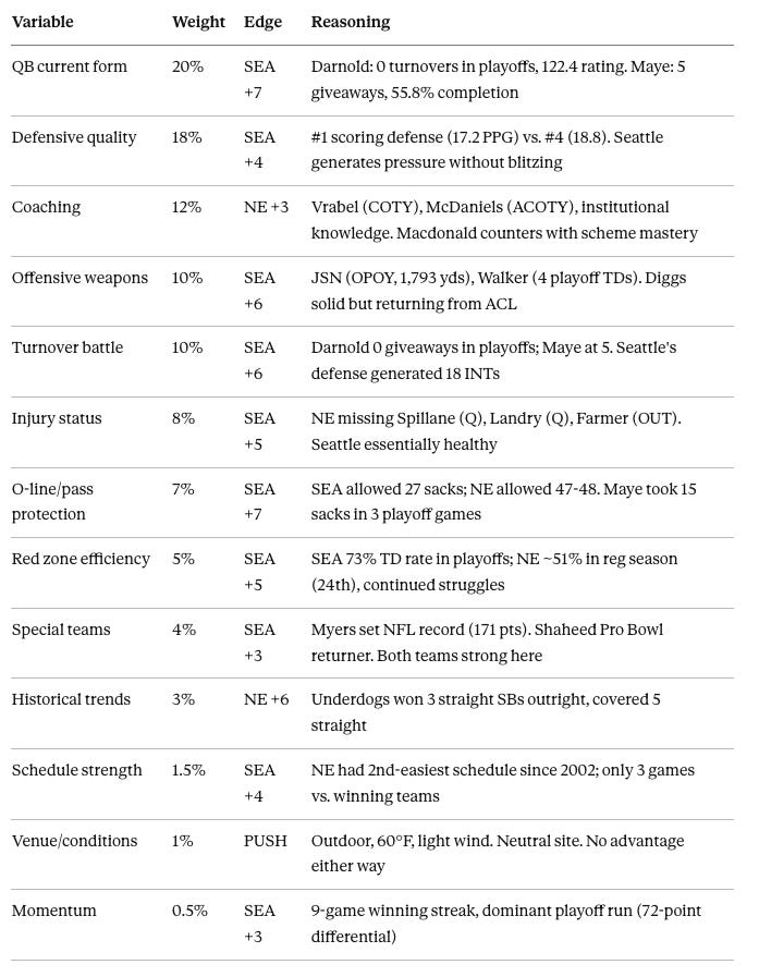 This framework assigns each variable a weight based on its demonstrated predictive power in Super Bowl outcomes, then scores each team on a -10 to +10 scale (positive favoring Seattle). The model incorporates regular-season performance, playoff trajectory, injury context, matchup specifics, and historical patterns.