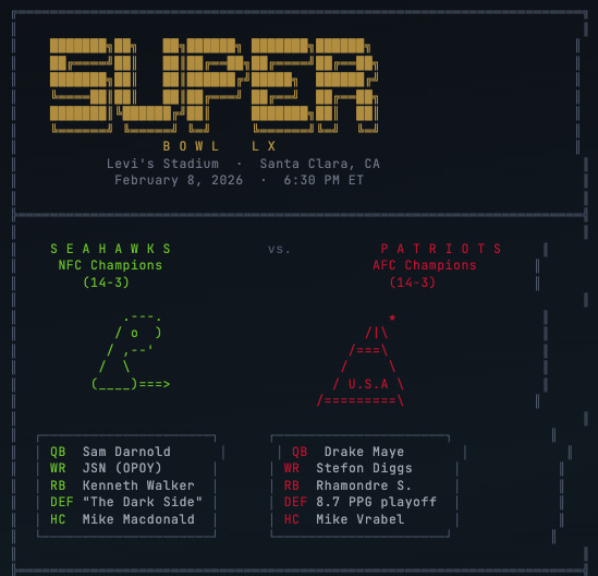 Seattle scores three touchdowns and a field goal against an elite defense. New England manages two touchdowns and a field goal against the league’s best. Jason Myers (NFL record 171 points, went 6-for-6 in a single game) gives Seattle a kicking insurance policy that Andy Borregales (1-for-3 in the AFC Championship) may not match.