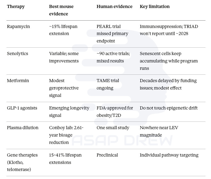 They’re right that incremental life expectancy deceleration is real and well-documented, that previous “breakthroughs” like resveratrol and HGH failed, that the mouse-to-human translation rate is terrible, and that Calico’s $3.5 billion failure is sobering.