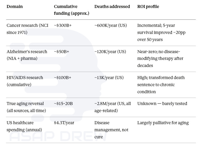 Alzheimer’s research has absorbed $50+ billion with essentially zero disease-modifying therapies approved. HIV/AIDS research, at around $100 billion cumulative, is the clearest success story, transforming a death sentence into a manageable chronic condition. True aging reversal has received perhaps $15–20 billion total across all sources in its entire history, most of that in the last 5 years. Yet aging kills roughly 2.8 million Americans per year through its downstream diseases, dwarfing every other category.