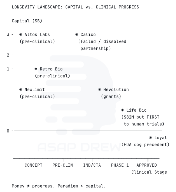 Calico ($3.5B spent). Google’s longevity moonshot, and probably the most expensive failure in the field’s history. AbbVie ended their 11-year partnership in 2025 with remarkably little clinical progress. Pursued healthspan interventions rather than true age reversal. A cautionary tale about what happens when you spend billions without the right paradigm.