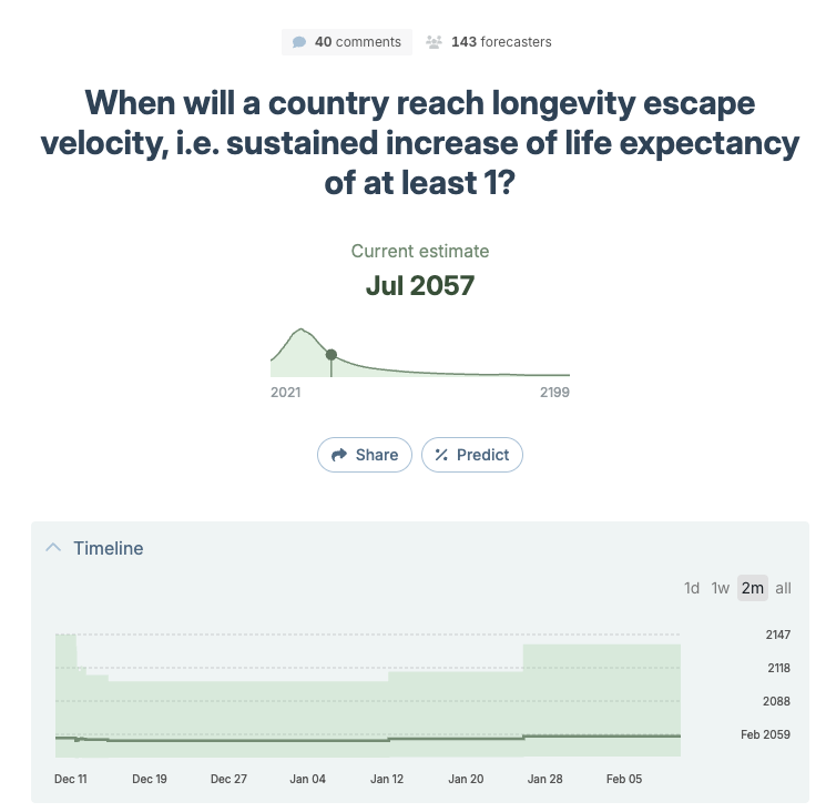 Claude’s revision reflects three things: (1) the political economy problem is more severe than technologists assume, with no mechanism for the resource shift the field needs; (2) bridge therapies are less useful than argued, especially for those with good baseline health; and (3) the Metaculus community itself, despite being a generally tech-optimistic crowd, places strict LEV at 2057 and softer LEV at 2066 with a meaningful “never” tail. I’m roughly in line with their community estimates, maybe slightly more pessimistic because I weight the political economy constraints more heavily than I think the average Metaculus forecaster does.