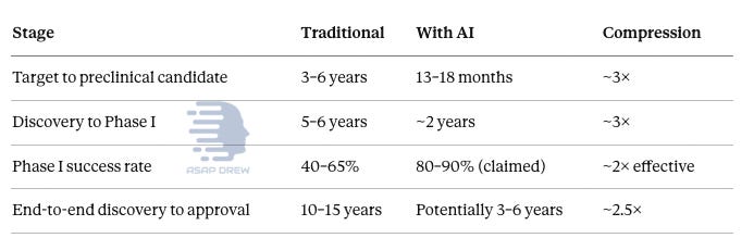 The most realistic overall estimate is that AI compresses the drug pipeline by 2–3×. A 15-year development cycle becomes 5–7 years. Useful but not paradigm-shifting unless the entire research infrastructure pivots toward closed-loop aging experimentation. That hasn’t happened and there’s no indication it will soon.