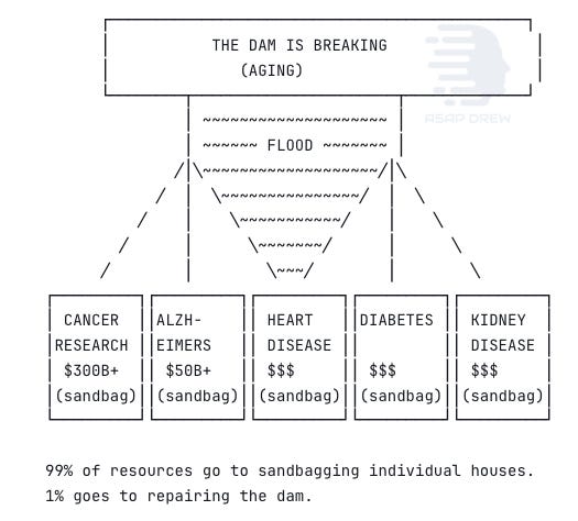 The world spends more treating Alzheimer’s alone than it has ever spent on the upstream cause of Alzheimer’s, cancer, heart disease, and every other age-related pathology combined. That’s not rational but it is stable. The institutional forces producing this allocation aren’t weakening. Private capital and billionaire philanthropy are pushing things forward but they aren’t substitutes for coordinated civilizational effort.