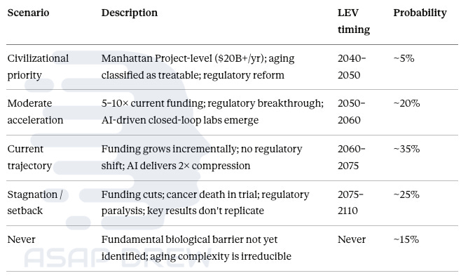 I give the civilizational priority scenario only 5% because there’s no political mechanism that would produce $20+ billion/year commitment. Moderate acceleration at 5–10× current funding with a regulatory breakthrough and emergence of AI-driven closed-loop labs gets 20%. Current trajectory, where funding grows incrementally and nothing structurally changes, is the most likely single scenario at 35%. Stagnation or setback from funding cuts, a cancer death in a reprogramming trial, or failure to replicate key results gets 25%. And 15% for “never” because there may be fundamental barriers we haven’t identified, or the hallmark interconnection and bioelectric degradation problems could create a ceiling no single paradigm breaks through.