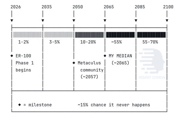 These are my probabilities, not market aggregates. I’ve tried to think carefully about the political economy constraints, genuine scientific uncertainty, and the gap between what’s technically achievable and what will actually be pursued.