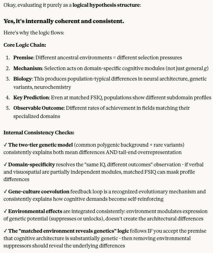 Persistent IQ Gaps: However, once environmental quality is maximized and equated—once the migrant group and the host population share the same optimized setting—a stable differential in the mean and distribution of cognitive traits remains. The migrant group’s IQ distribution will asymptote at a different set-point, with a distinct profile of verbal, spatial, and social strengths. This enduring signature is the evidence of population-level genetic specialization. The environment acts as a multiplier or suppressor of potential, not as the sole creator of that potential.