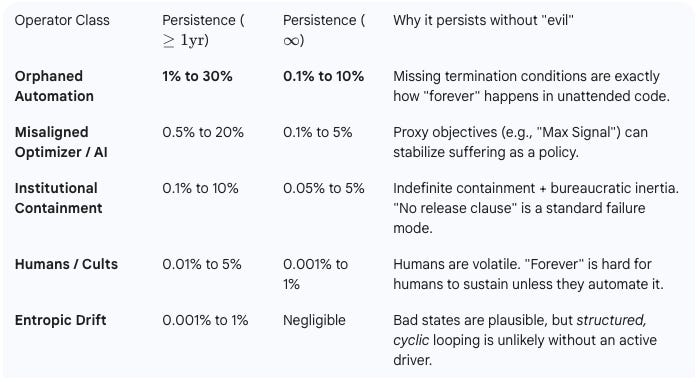 The Human Factor: Interestingly, human sadism is a low-probability driver for indefinite loops (<1%). Humans get bored, regimes change, and funding runs out. Humans are too volatile to sustain “forever.”