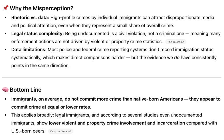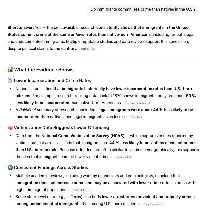 And the average layperson just believes what they hear in the media or after asking ChatGPT: “Do immigrants commit less crime than natives in the U.S.”