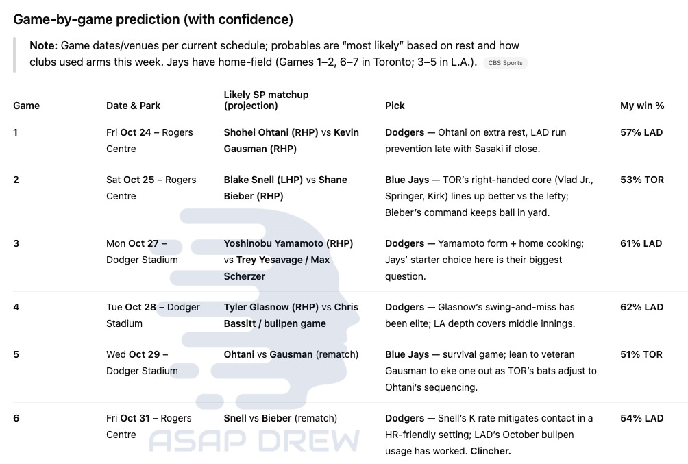 Path logic: L.A.’s top‑4 SPs + a now‑trustworthy back end (Sasaki) win the run‑prevention battle most nights, even with Toronto’s hotter bats.