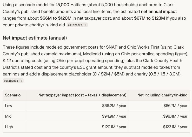 If we quickly model out all associated costs for the ~15,000 Haitian refugees in Springfield, Ohio (ESL, education, healthcare, housing, EBT/TANF, childcare, transportation, plus job displacement of natives), we’re looking at ~$66.2M/yr (low end) to $120.1M/yr (high end) of net negative fiscal impact.