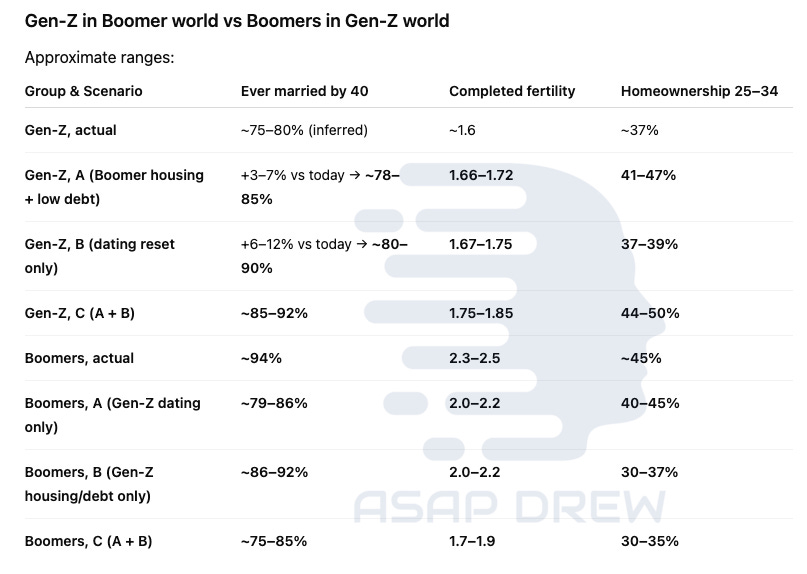 Story: Put Boomers inside a Gen‑Z‑style economic and dating environment and they look much more like today’s cohorts: more long‑term singles, fewer kids, fewer young homeowners — even though they still have the more stable late‑20th‑century labor market.