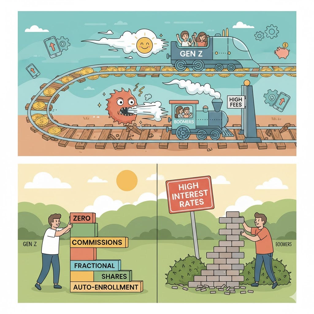 15–20% gross to retirement + taxable index funds by default; auto‑increase 1–2 %/year. You have near‑zero fees and $0 commissions—a structural surplus Boomers didn’t enjoy at 25.
