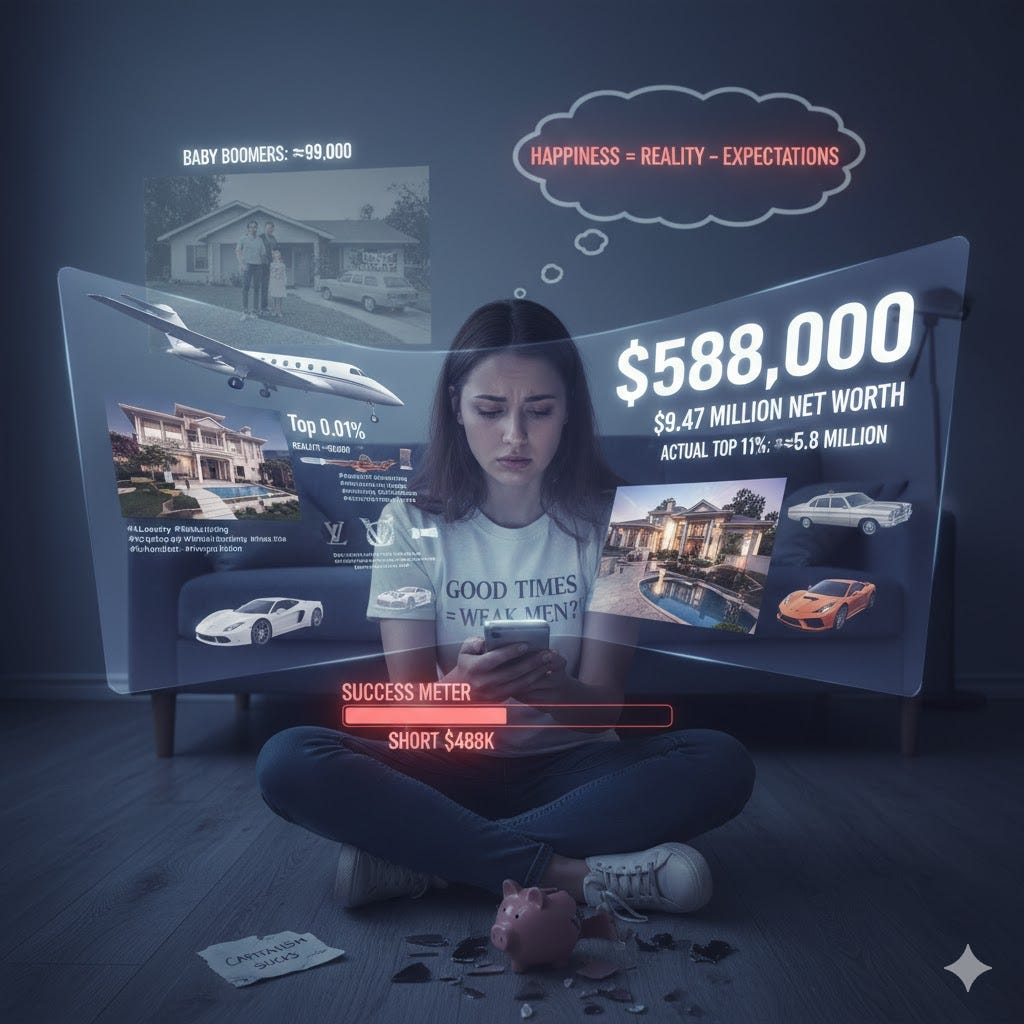 Algorithm-Induced Dysmorphia: Boomers compared themselves to their neighbors (who drove Fords). Gen Z compares themselves to the curated “Top 0.01%” on TikTok/Instagram (who fly private). The “average” life is invisible on social media, making “extreme wealth” look like the baseline.