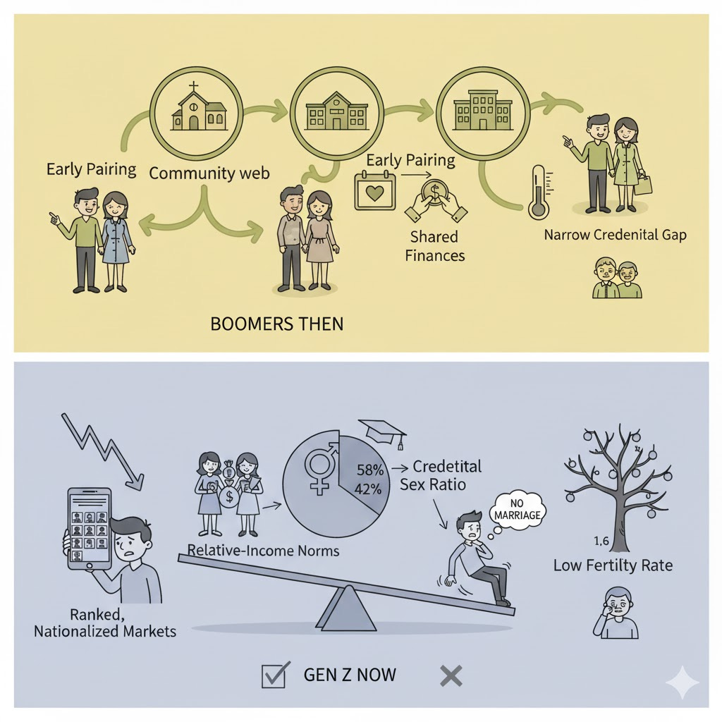 Story: Modern dating norms by themselves are strong enough to push Boomers down toward bare‑replacement fertility and non‑universal marriage, even though buying a house is still easy.
