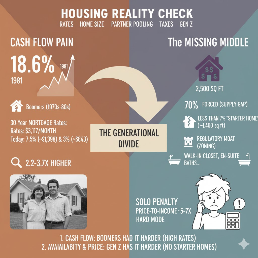 Rates vs. prices: Boomers swallowed brutal mortgage rates (30‑yr fixed peaked ~18.6% in 1981) but on much cheaper, smaller homes; Gen Z faces lower rates (even at 7–8%) but far higher price‑to‑income multiples and larger baseline house sizes. (Harvard Joint Center)