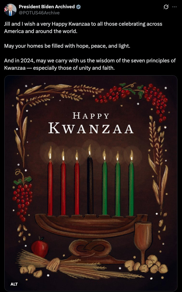 In December 2022, President Joe Biden and First Lady Jill Biden released a video message praising Kwanzaa’s “seven principles” and giving “thanks for the rich heritage of African Americans.” (R)