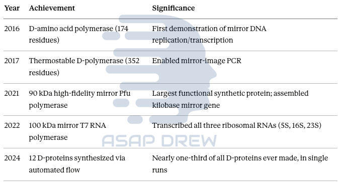 2021: Largest synthetic protein ever made—90 kDa mirror Pfu polymerase assembled kilobase-length mirror gene and stored text in L-DNA stable for 1+ year in pond water (Fan et al., Nature Biotechnology)