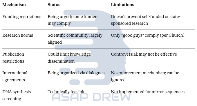 The counterargument: Creating a functional mirror organism still requires massive wet-lab infrastructure, not just in silico design. AI can’t yet design fully replicating systems from scratch. The “Paraphrase Project” showed evasion of screening, but also prompted rapid patches to screening software.