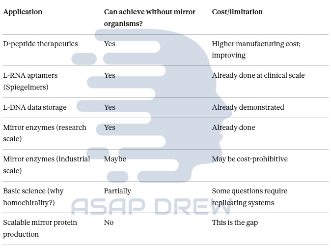 Much of the upside attributed to “mirror life” appears substitutable via: (1) mirror components made without self-replication, or (2) entirely distinct competing technologies.