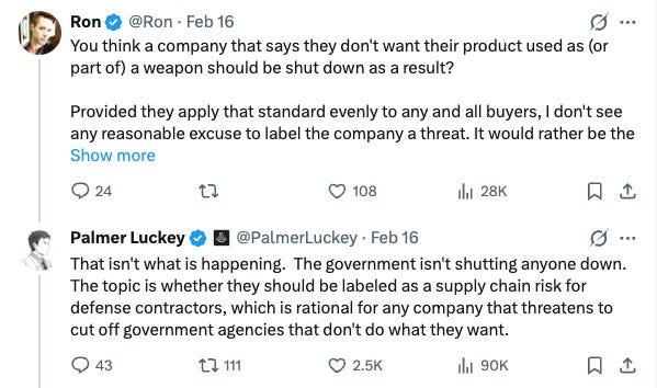 There’s a reading of this standoff that’s more strategically coherent than the tribal takes: Anthropic is hedging. Trying to stay viable across administrations by refusing to be stapled to the next domestic scandal.