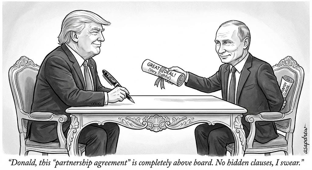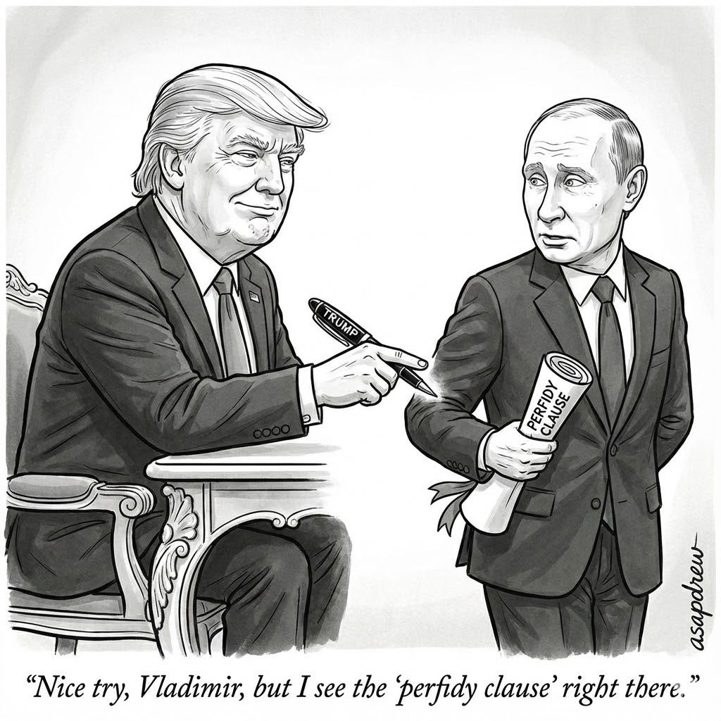 No escape from attrition: Perfidy doesn’t stop casualties. Western and independent estimates still show Russia suffering over a million total casualties, with some analyses suggesting five Russian soldiers killed for every Ukrainian in 2025. Even if he gets an okay deal, Putin still ends up with: