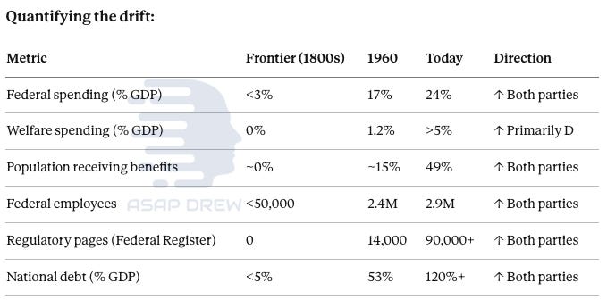 National debt (% GDP) Frontier: <5% | 1960: 53% | Today: 120%+ (Trend: ↑ Both parties) (R)
