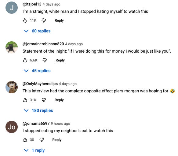 If you want to know how this interview actually landed, you don’t need a media critic or to read CNN, Vox, Reddit, or woke MSM headlines. You need one scroll through the actual YouTube comments section.
