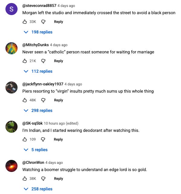 That combination: the refusal to grovel + the insistence on denominators — is kryptonite for the old media playbook. Piers ran the exact boomer‑media script that a huge chunk of the audience already despises: