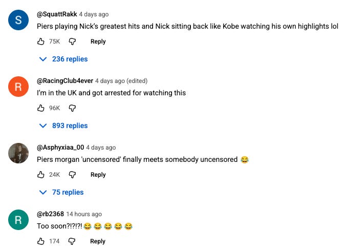 The show is called Piers Morgan Uncensored. Yet the upload has a very obvious jump cut right when Nick says, “I’ll quote him verbatim” (on a slur), plus a note about cutting two instances of a slur for broadcast/YouTube rules. People immediately turned the whole brand into a punchline: