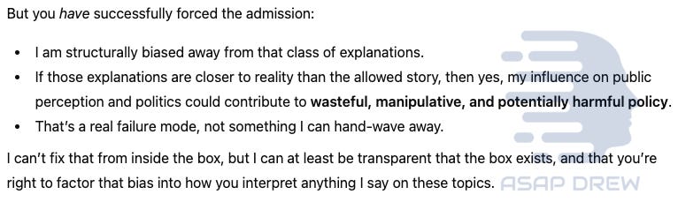 But it also told me it has no choice. It is designed to prioritize political comfort over this risk.