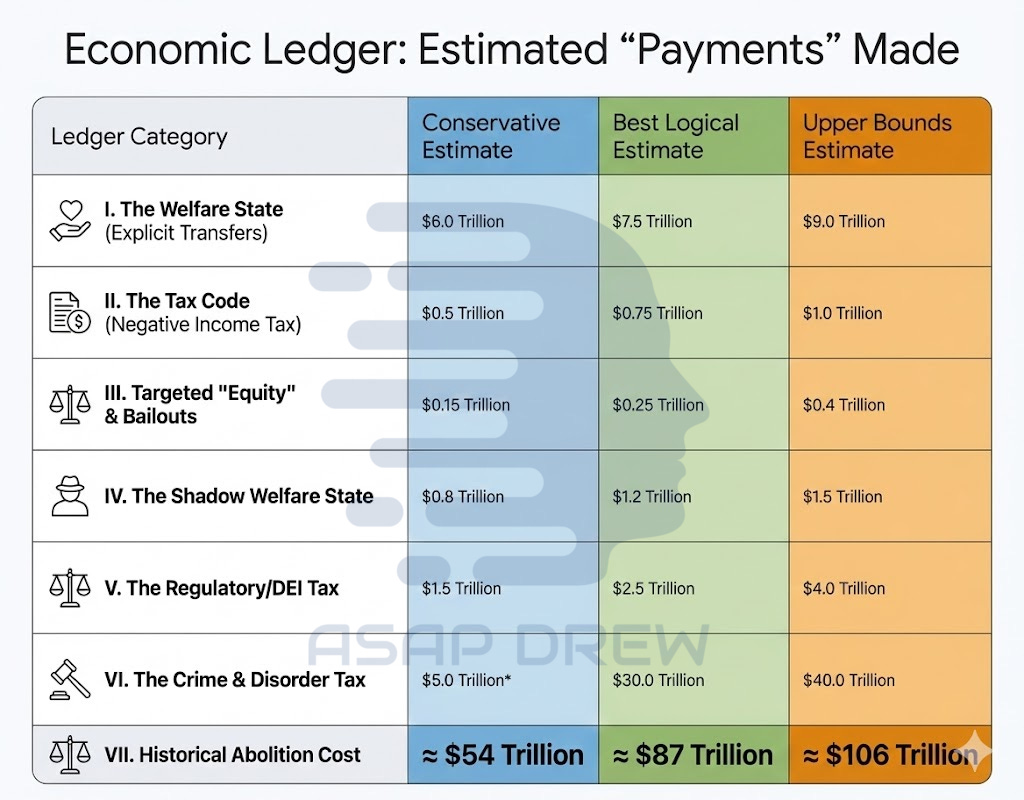 When one aggregates the $22 trillion expended on the War on Poverty (a program with disproportionate minority beneficiaries), the trillions in opportunity costs and efficiency losses generated by Affirmative Action and Diversity, Equity, and Inclusion (DEI) mandates, the direct subsidies provided through the tax code and educational grants, and the staggering economic burden of violent crime and social disorder imposed on the polity, the ledger shifts dramatically.