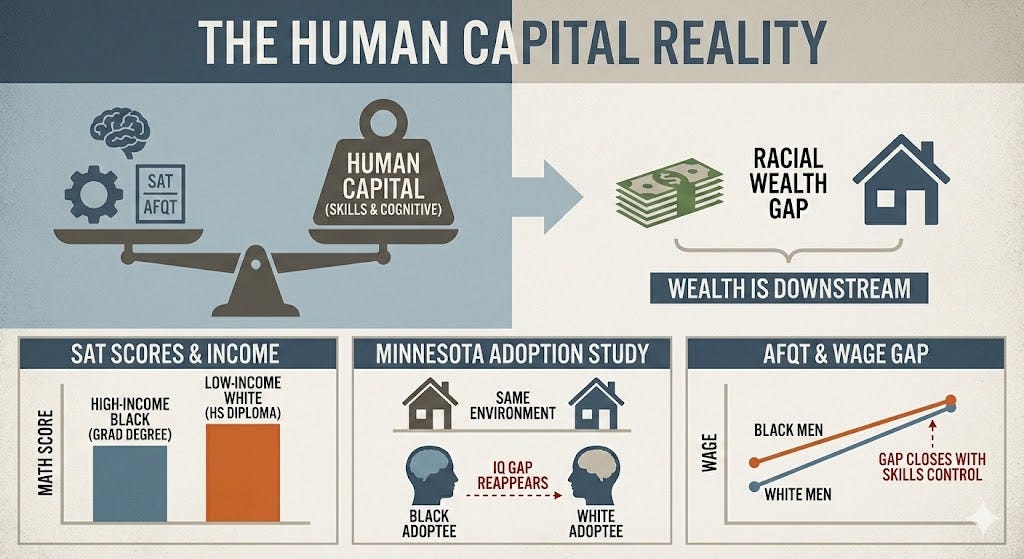 This is not just wrong; it is empirically disproven. The wealth gap is not a cause of dysfunction; it is a downstream effect of the human capital gap. We know this because we have tested every variable—cash, environment, and racism—and the gap persists.