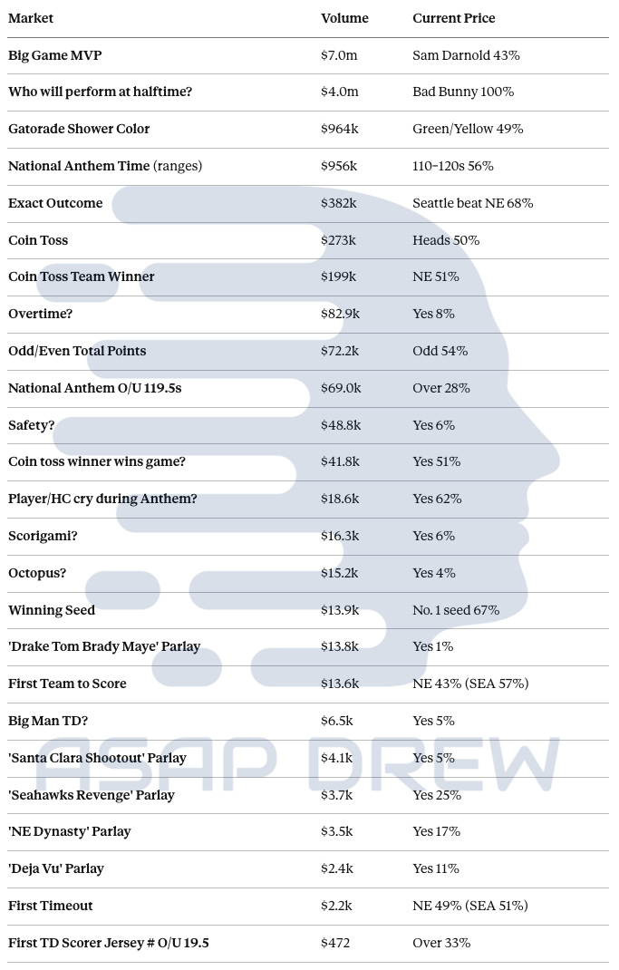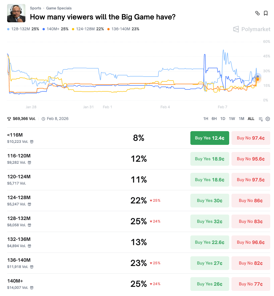 Polymarket’s Super Bowl LX hub lists 25 active game-prop markets plus additional clusters for ads, halftime, celebrity attendance, broadcast mentions, and viewership. Here’s every game-prop market, ranked by volume, with today’s odds.