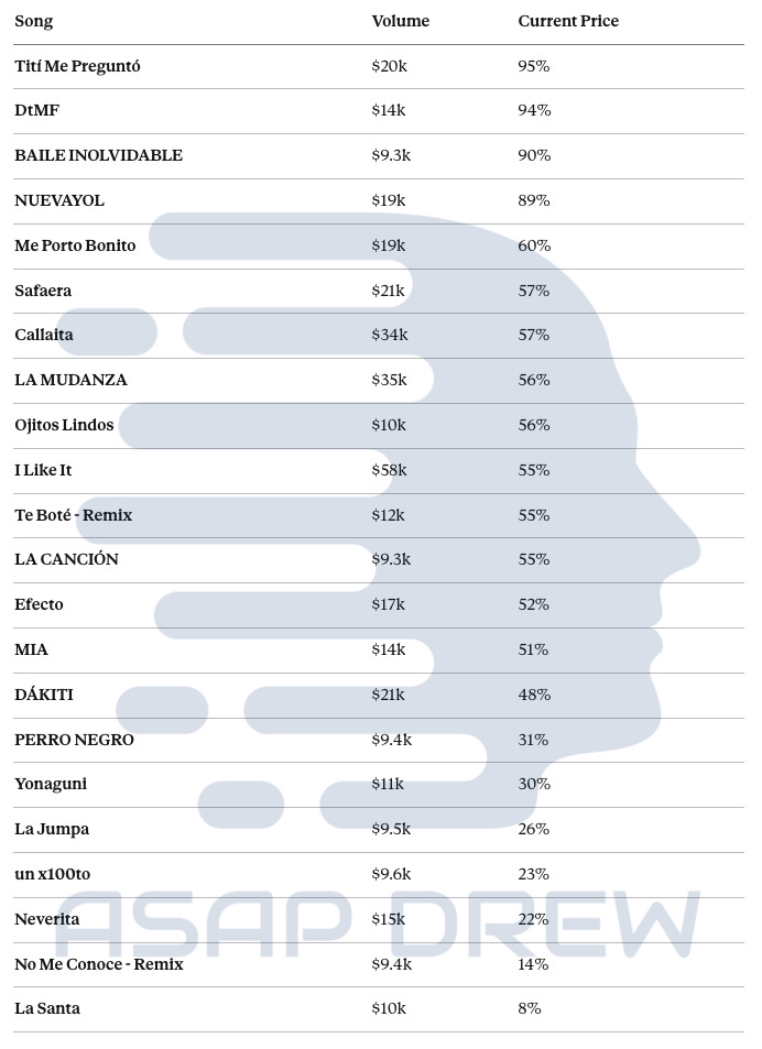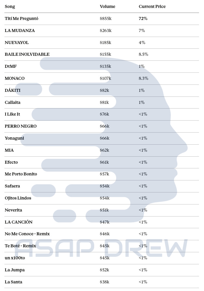 Tití Me Preguntó — $20k. 95%. The only song above 90% in both markets.