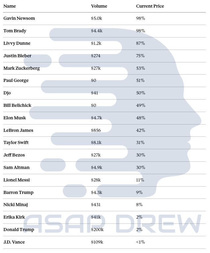 Celebrity attendance — Same story. Newsom (98%) and Brady (98%) are settled. Zuckerberg (53%), Musk (48%), Swift (31%), Bezos (30%) are genuine uncertainty but unanchorable.
