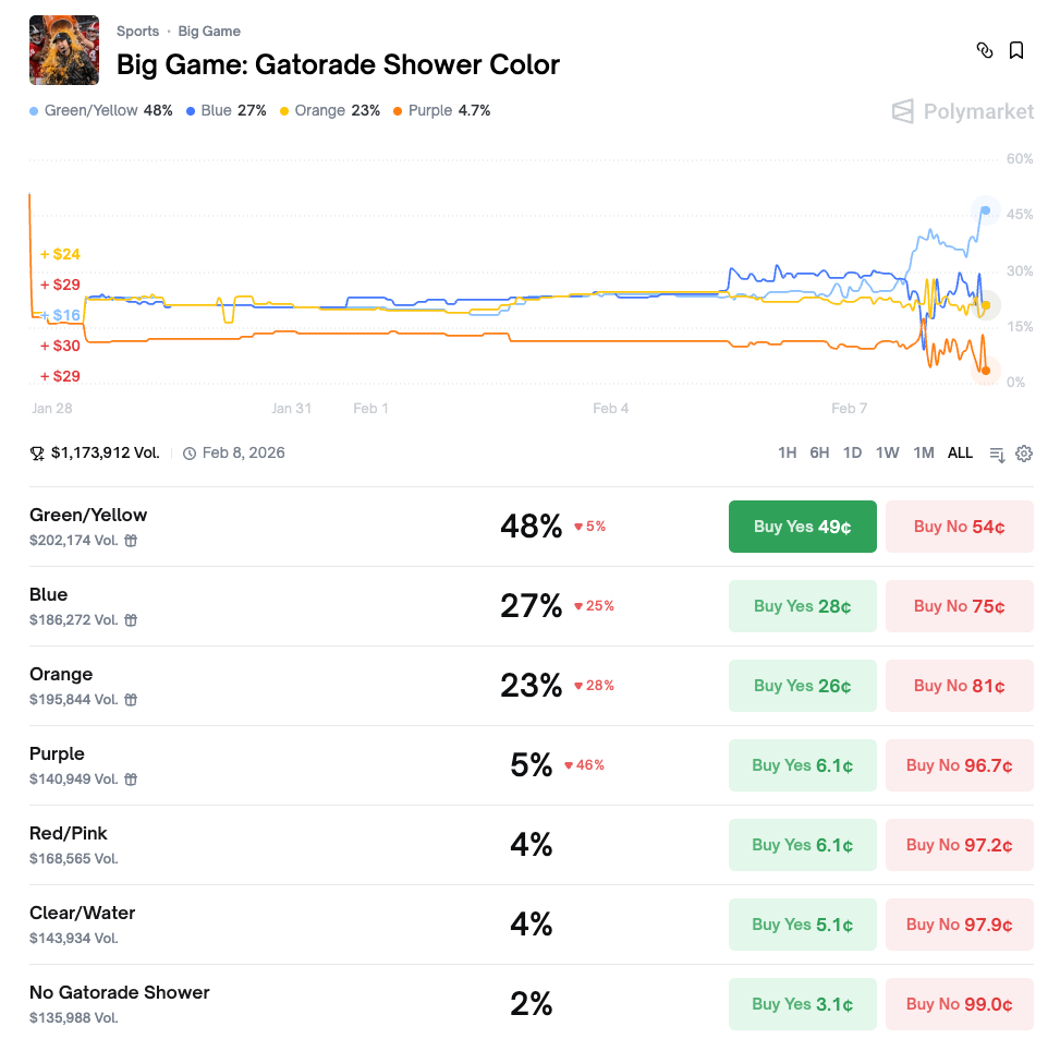 Gatorade Shower Color — $964k. Green/Yellow has surged to 49%, up from ~29% initial odds. BetMGM also moved Green/Yellow to favorite (+175) but only implies ~32% no-vig — a major Polymarket overshoot. See Section III.