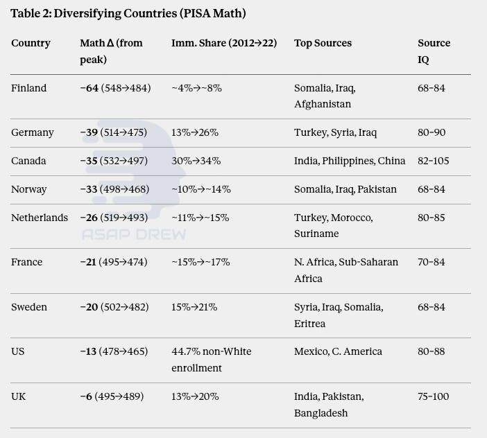Germany — immigrant share doubled in one decade; native-immigrant gap is 59 PISA points (32 after SES controls). The 1.1M refugees from 2015 came from Syria (~83 IQ), Iraq (~87), Afghanistan (~84).